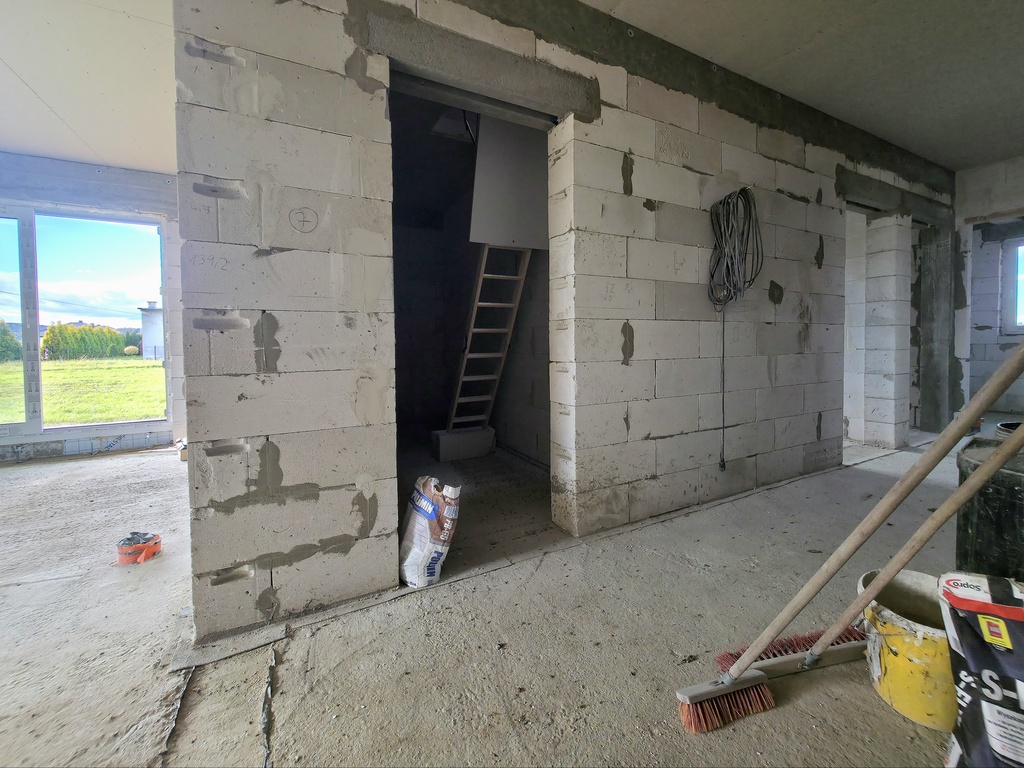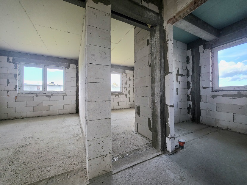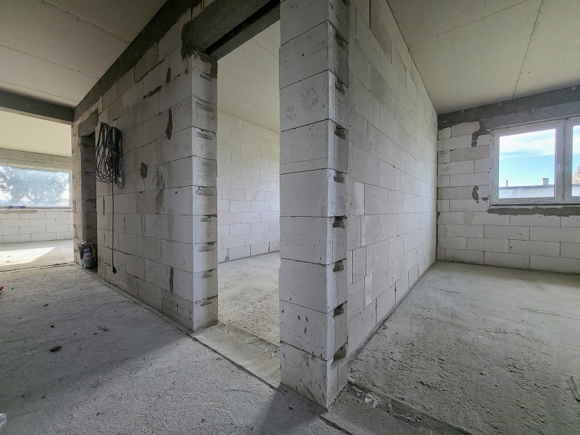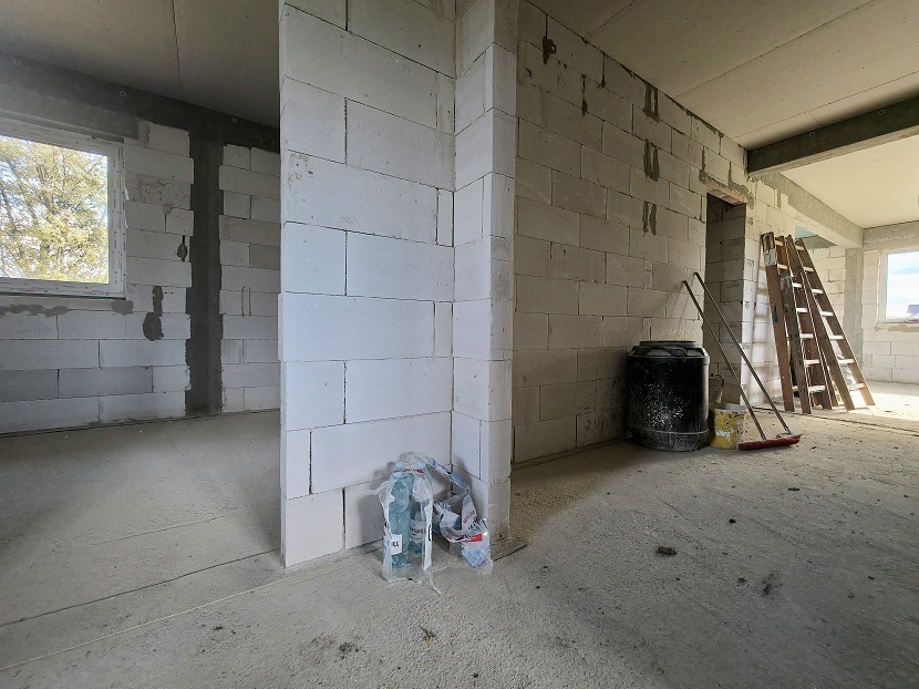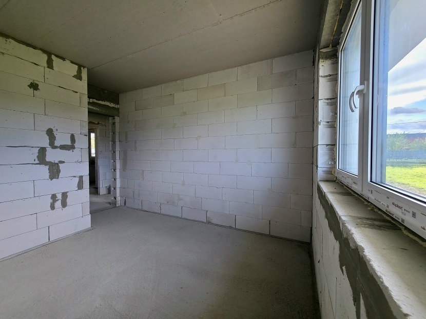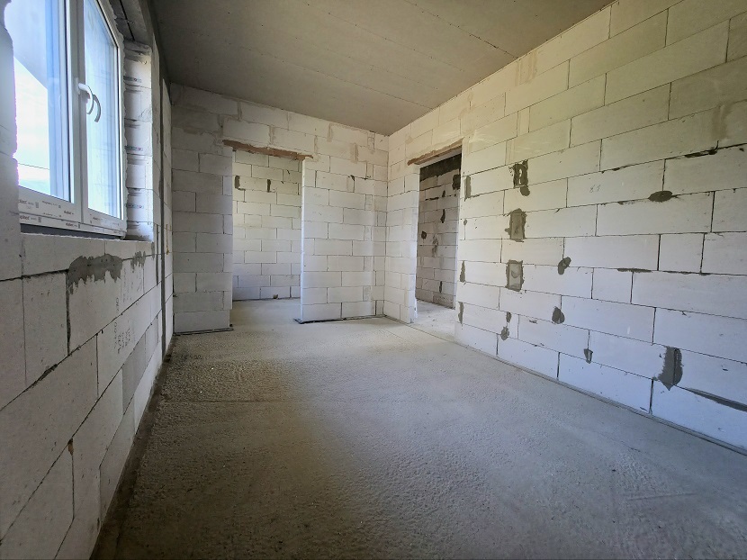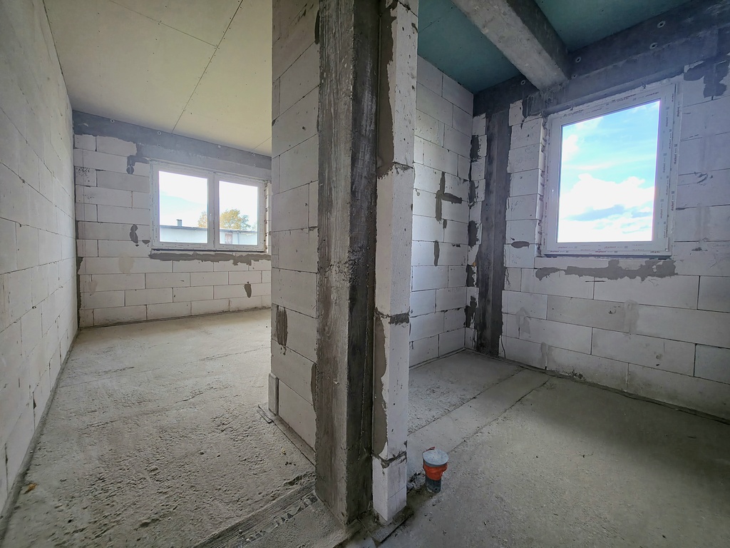 Budynek jest w stanie surowym wewnątrz, co daje możliwość własnej aranżacji i wykończenia według indywidualnych preferencji.