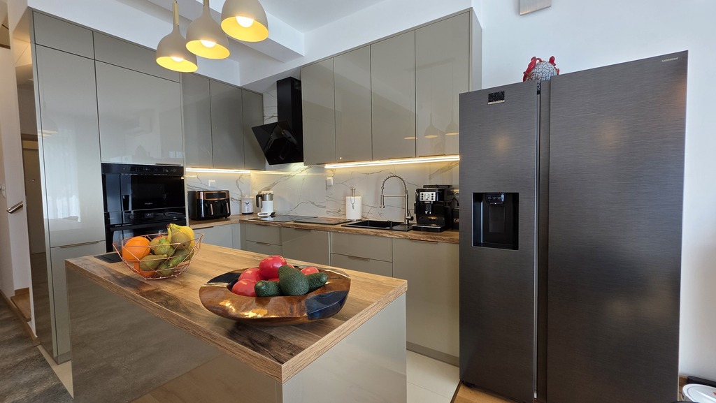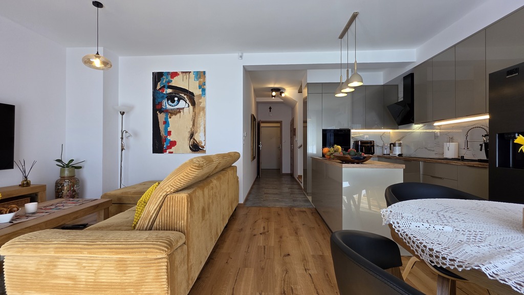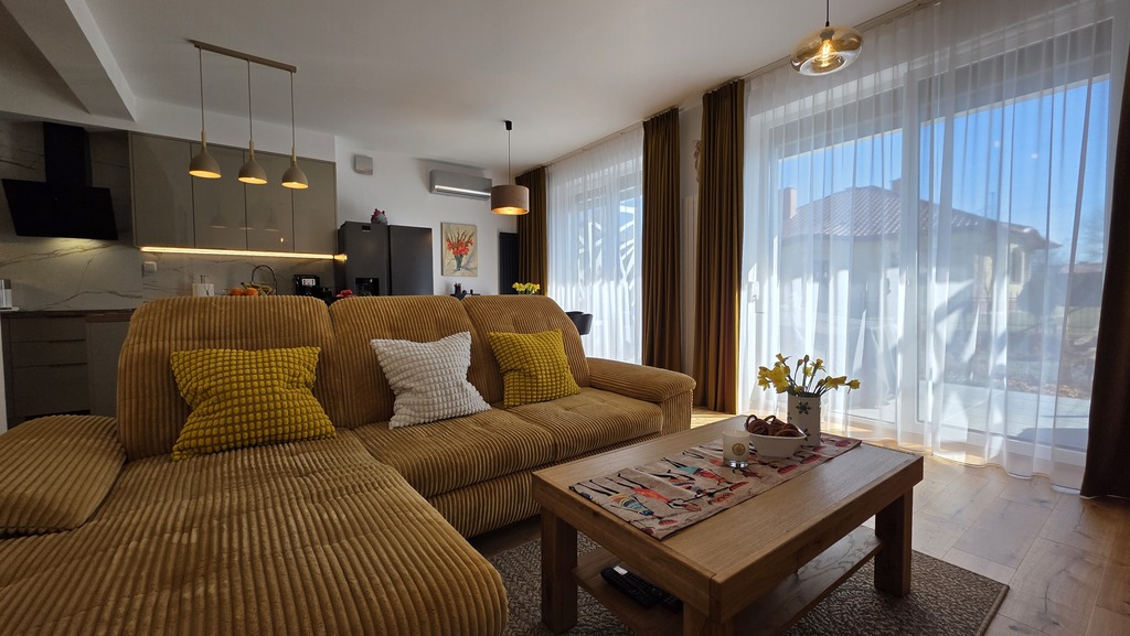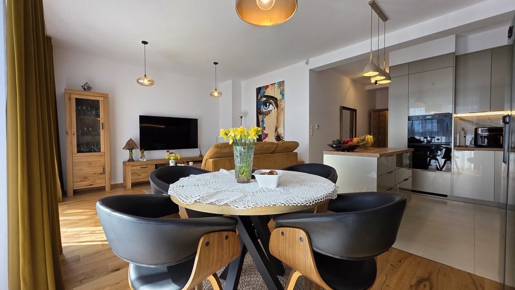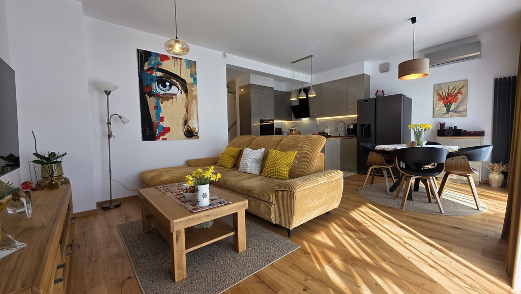 - Przestronny salon z aneksem kuchennym i wyjściem na ogród